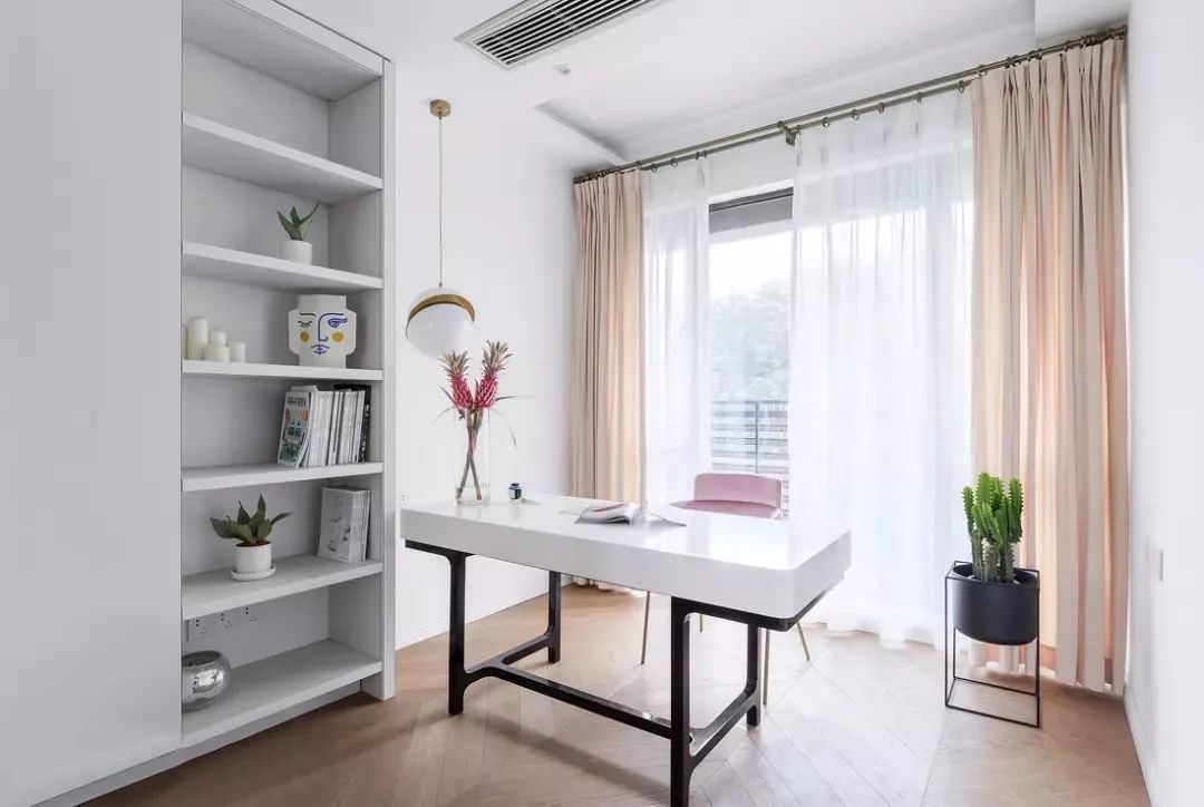 书房,大面积的落地窗,弥补了书房采光不足的遗憾。自然白与茱萸粉和谐并存,力求用简单的色彩区别于其他现代风格的厚重感。