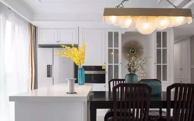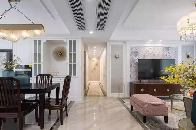 客餐厅在同一水平视线上,然后用吊顶以及地砖进行了区域划分,显得两个空间更加的独立些。然而加上现代美式风元素的装饰,看着还特别的温馨舒适又浪漫呢!
