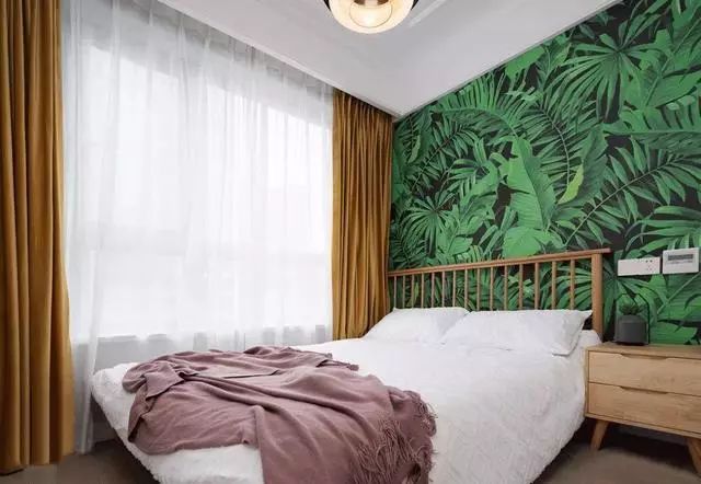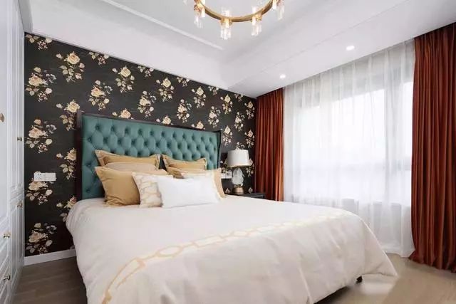 床头背景墙用的是壁纸装饰,还有红白两色的窗帘搭配效果也是很好的。