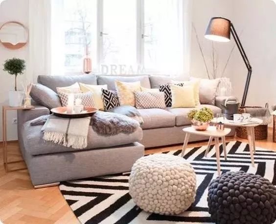 一般的家庭来客不多的情况下,双人座或三人座的沙发就足够用了,再搭配两把单人沙发,几个小矮墩就能完美解决来客时的入座问题,而且使用起来特别灵活方便,不同的摆放组合就能呈现不同的效果。