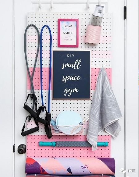 瑜伽垫收纳也很方便。洞洞板、纸篓、置物架都可以用来搁置它。