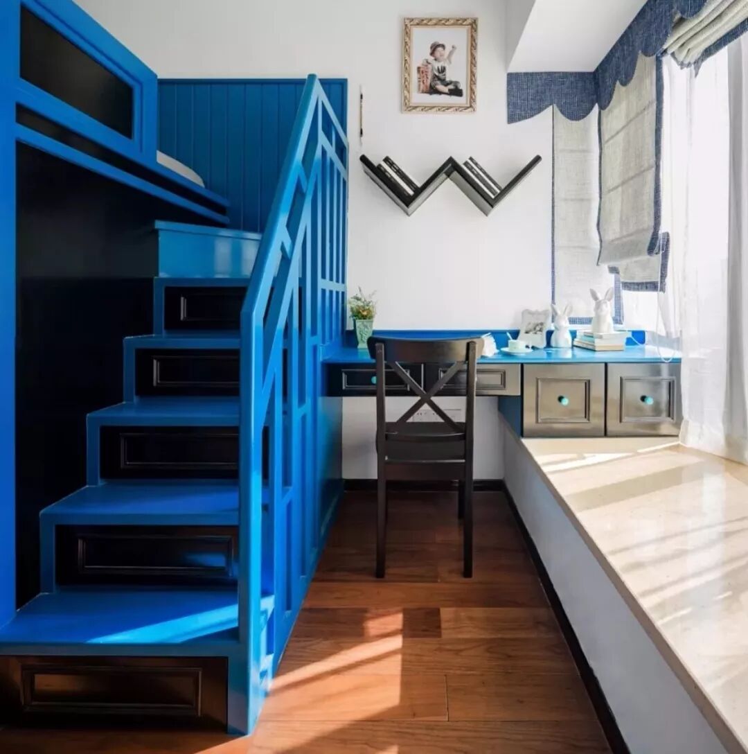 将飘窗改成工作区,不仅光线好利于学习,还最大化的利用了空间,十分巧妙。同时可以在书桌旁边安装小书柜或吊柜,用于存放工作资料,无论是存放还是拿取,抬手就能做到,很方便!
