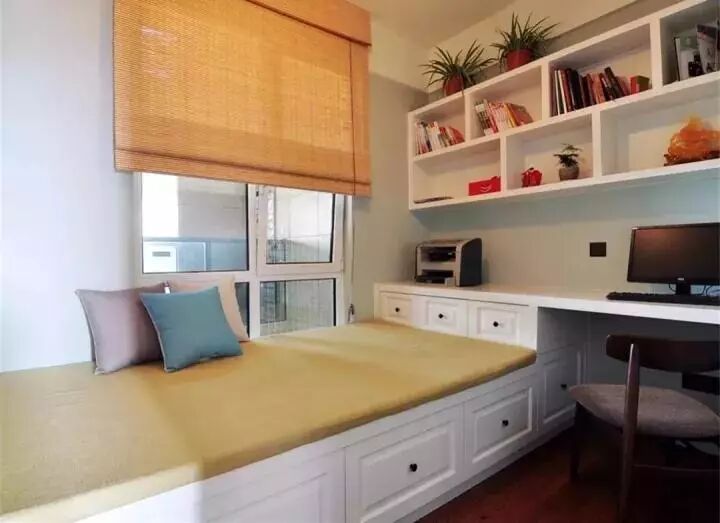 书桌和榻榻米结合,可实现办公休息一体化。如果再加上储物柜设计,那书房的收纳功能无疑超强。