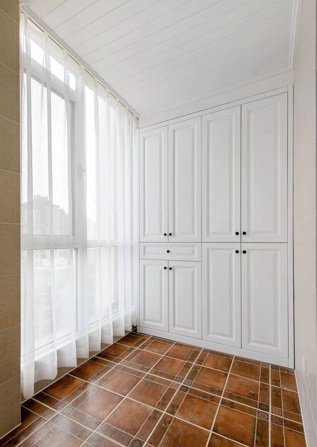 南北阳台各司其职,北阳台打造成晾晒区,洗衣收纳简洁方便。南阳台更多的是用于休闲,靠一侧墙面打造了通顶收纳柜,休闲实用两不误。