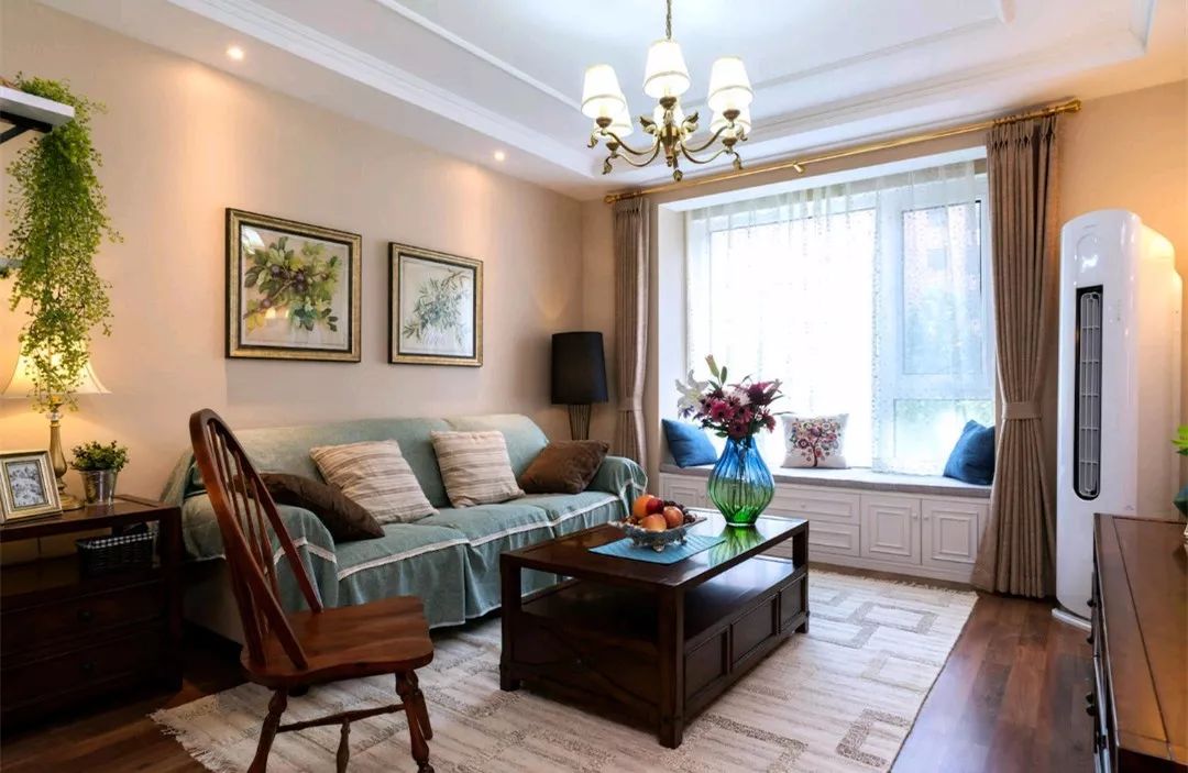 沙发背景墙是乳胶漆加上挂画的设计,客厅不靠阳台而是有个小飘窗,对于小户型来说,是个很好的收纳和座位补充。深木色的美式风家具带来格调感。