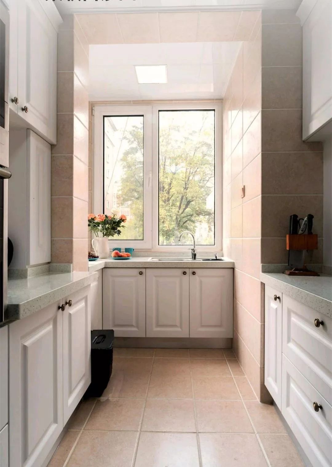 厨房的设计会更为现代一些,通铺棕色的仿古砖来和客餐厅的背景色相互呼应,搭配白色的橱柜和浅灰色的大理石体面,看起来更加简单轻松。