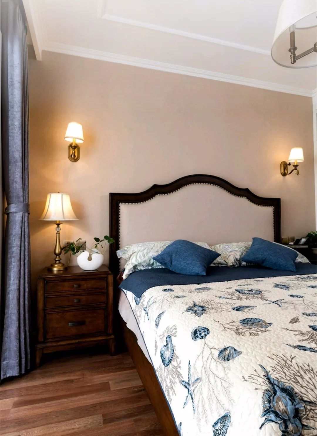 主卧室的床选择了软包靠背的款式,深色的床和床头柜搭配暖色调的背景墙和对称的壁灯,顶部不做吊顶,用石膏线走圈,看起来更加简洁。