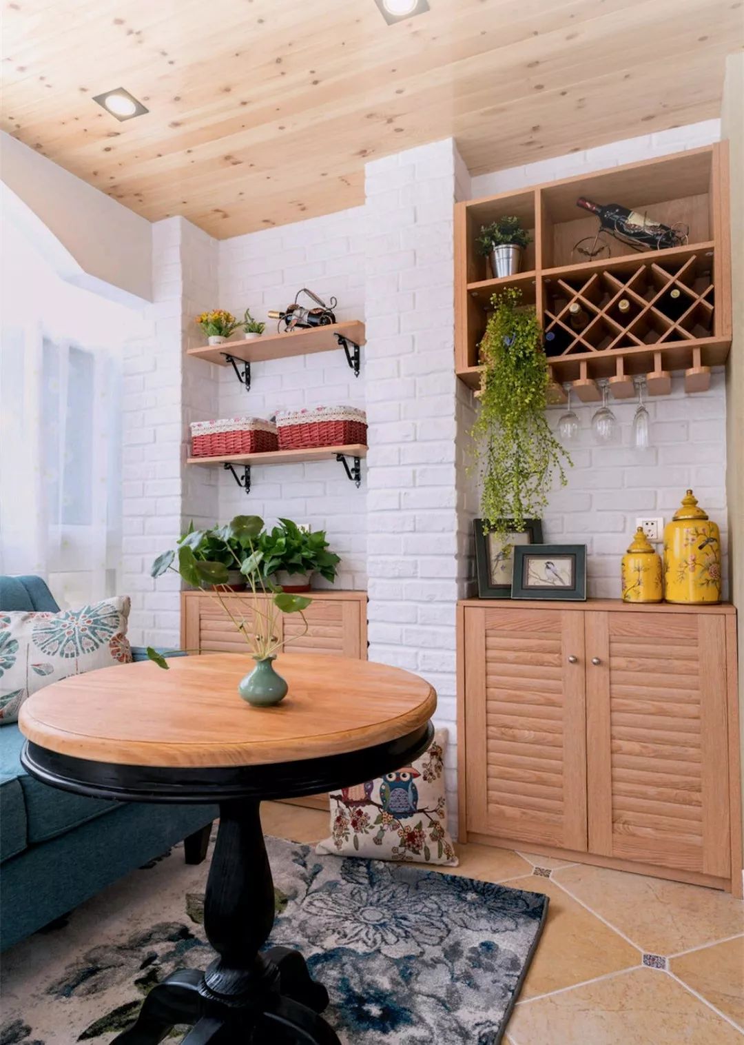 客厅位于餐厅的另一侧,文化砖墙也延伸到了客厅处,还搭配了置物架和绿植。客厅的电视背景墙刷上乳胶漆加石膏线,简洁而又大方。