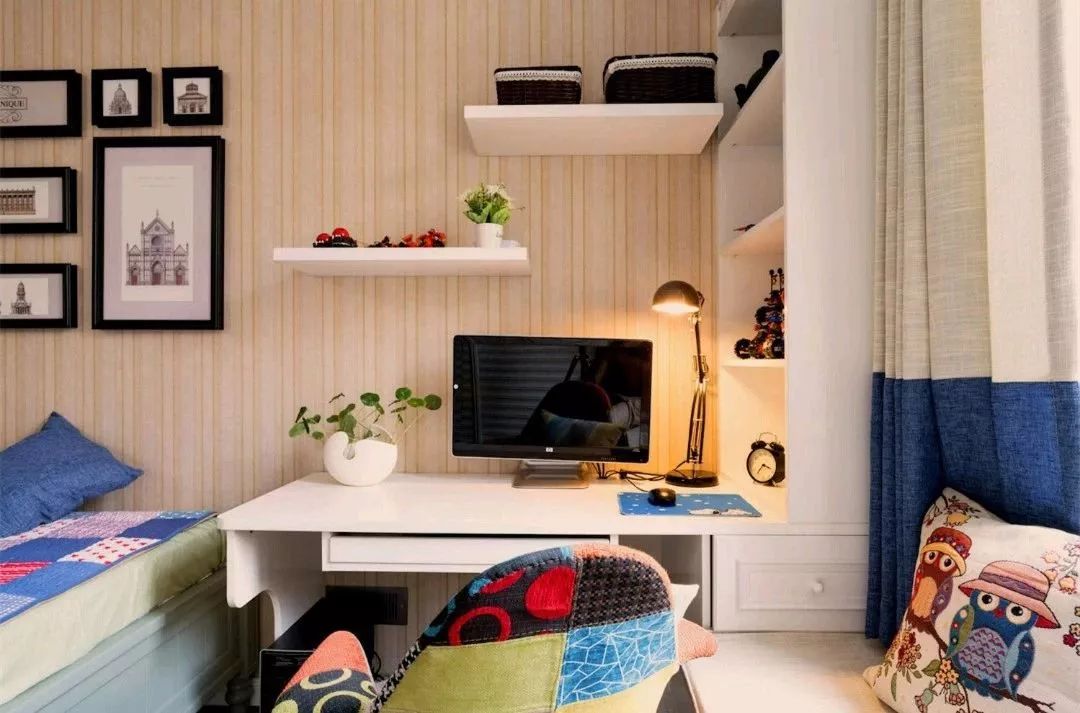 儿童房的墙面铺贴了竖纹的壁纸,榻榻米床加书桌和飘窗的设计,不管是收纳、学习和休憩的需求都能得到满足,转角的柜子和墙面的隔板增强储物能力。