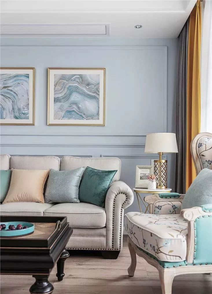 ▲客厅墙面选择将蓝绿色色彩纯度降低,明度中度,家具配以各类同色系软装丰富空间色彩层次。
