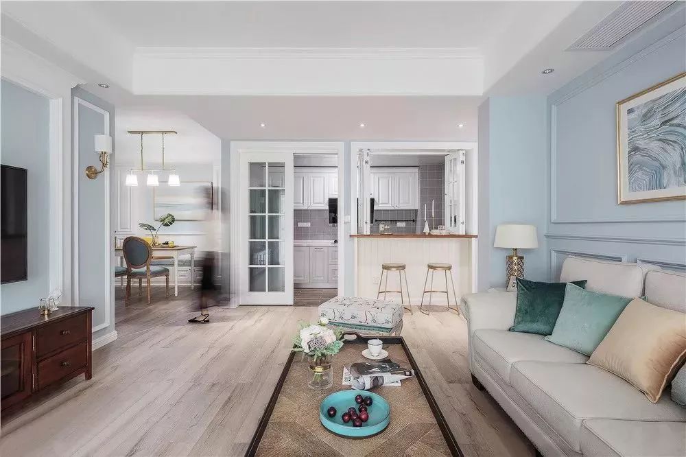 更多装修案例、家居经验欢迎关注微信公众号:jia-ms (美式装修案例精选)房屋资料面积:100㎡户型:3室2厅1卫风格:美式美式风格,像是一首浪漫的诗,激发内心探求自由生活的渴望,带来的不仅是生活方式的解读,也是现实生活的生动呈现。▲ 入户门厅通往客厅的空间呈不规则,设计师利用原本的户型加上门