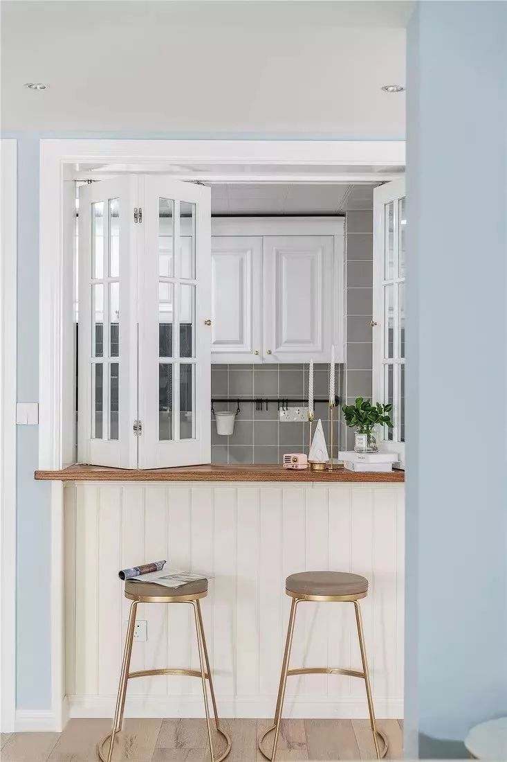 ▲玻璃推拉门和玻璃折叠窗的设计保证了空间的相对独立,又增添了厨房和客厅之间的联系互动。既增加了趣味性,也开阔了厨房视野。