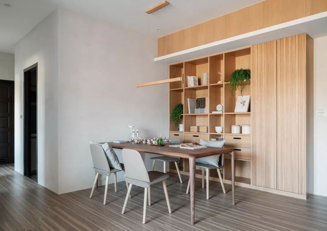 在入户门的另一侧就是餐厅空间,同样利用墙面做了柜子,封闭式的柜子和开放式的展示架结合起来,让餐厅更加美观和实用。