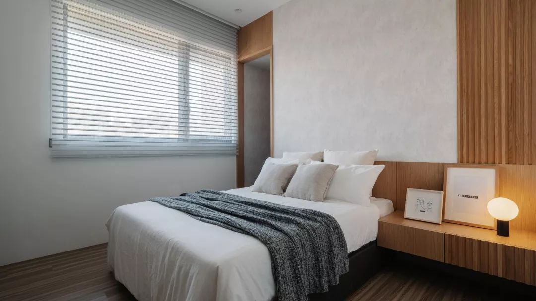 主卧室也是以白色和木色为主,大面积的了留白和白色的软装,在木质感的床头造型和灯光的衬托之下,显得简洁而又大方。
