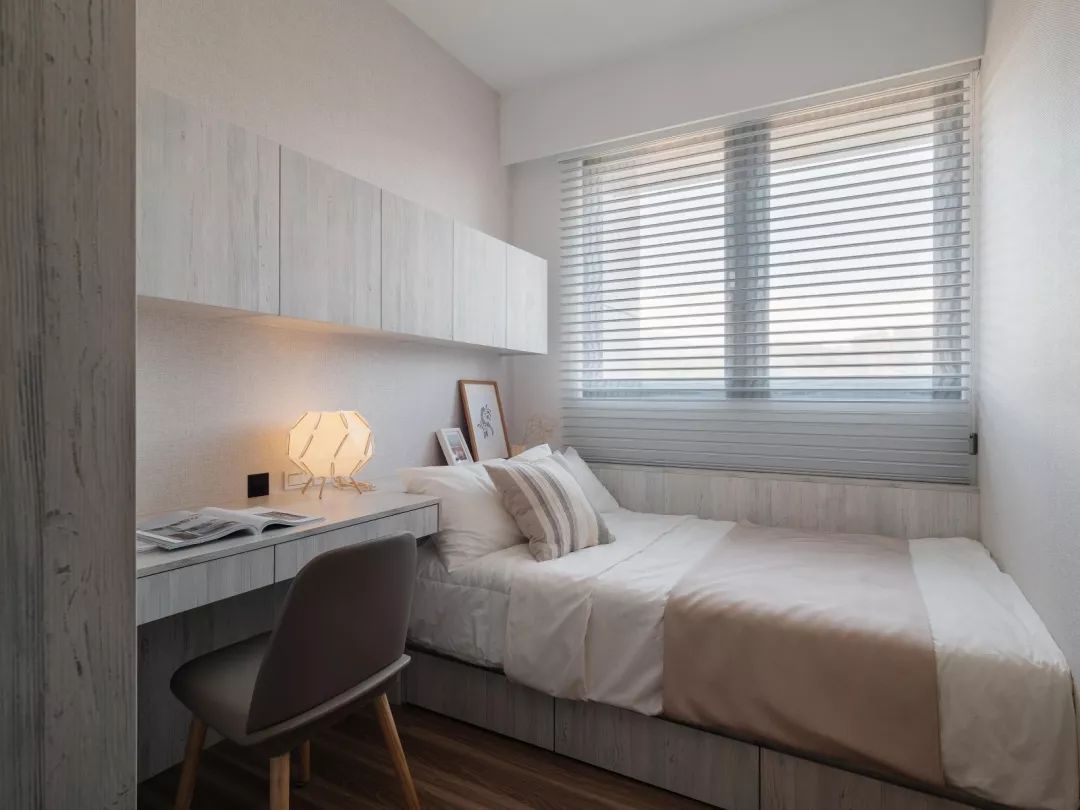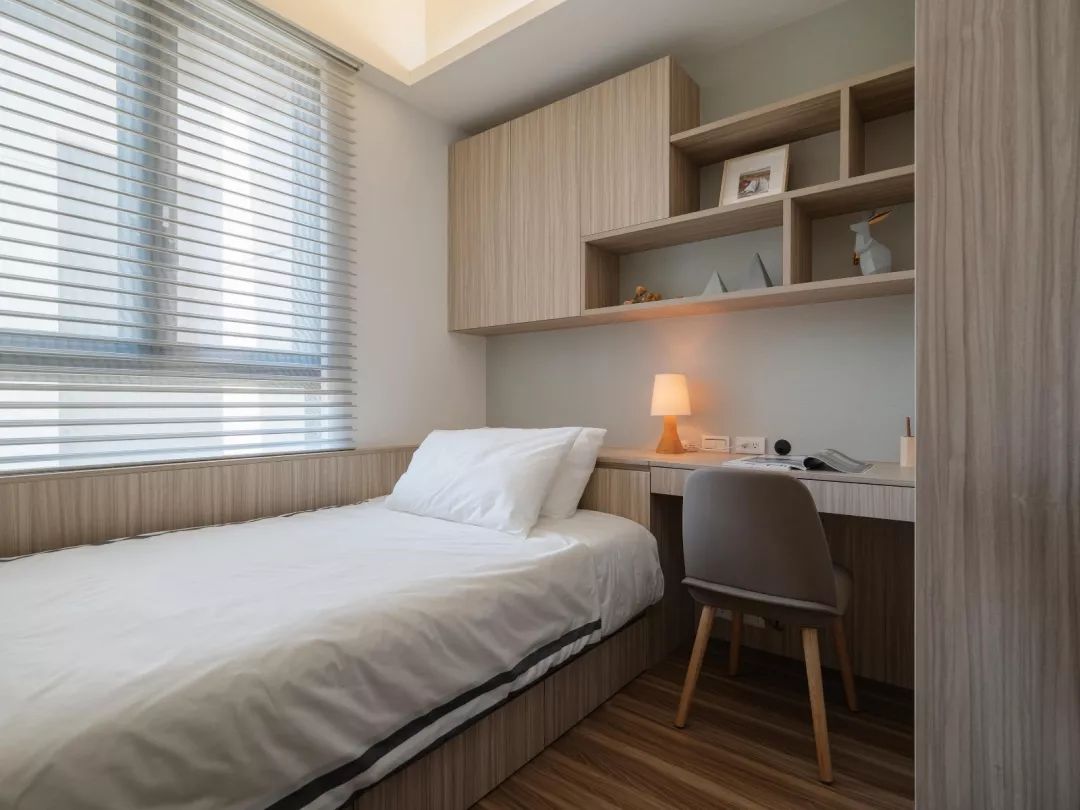 备用次卧的设计和儿童房大部分相同,就是面积更小一些,书桌没有做那么大。榻榻米的组合式设计很适合小卧室,能让空间被充分利用。