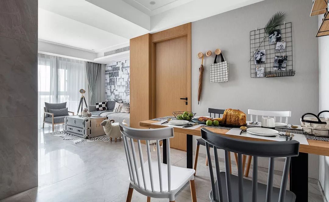 ▲这是由厨房看向餐厅的角度,餐厅与次卧的墙面做了简单的收纳,纽扣挂钩、网格架既可以装饰也可用于挂东西。