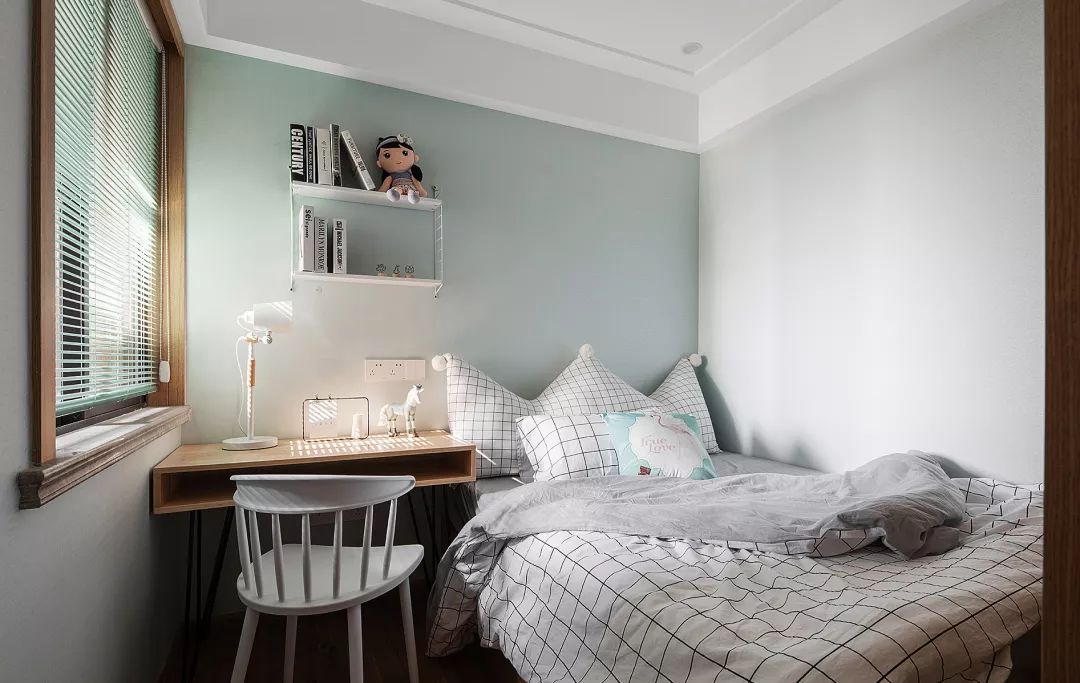 ▲绿色的墙面,安装了简易的书架,可以收纳少量的书籍,格子床品,还有后面搭配的床头靠枕,软软的,让人躺上去就不想起来的念头。