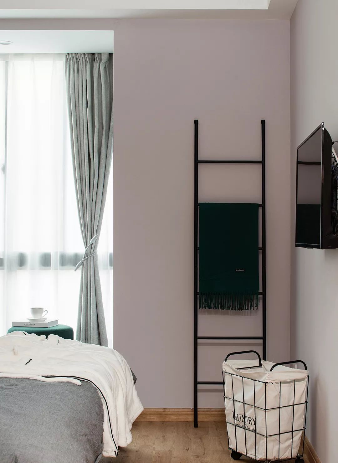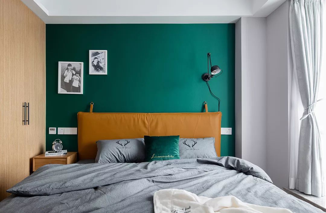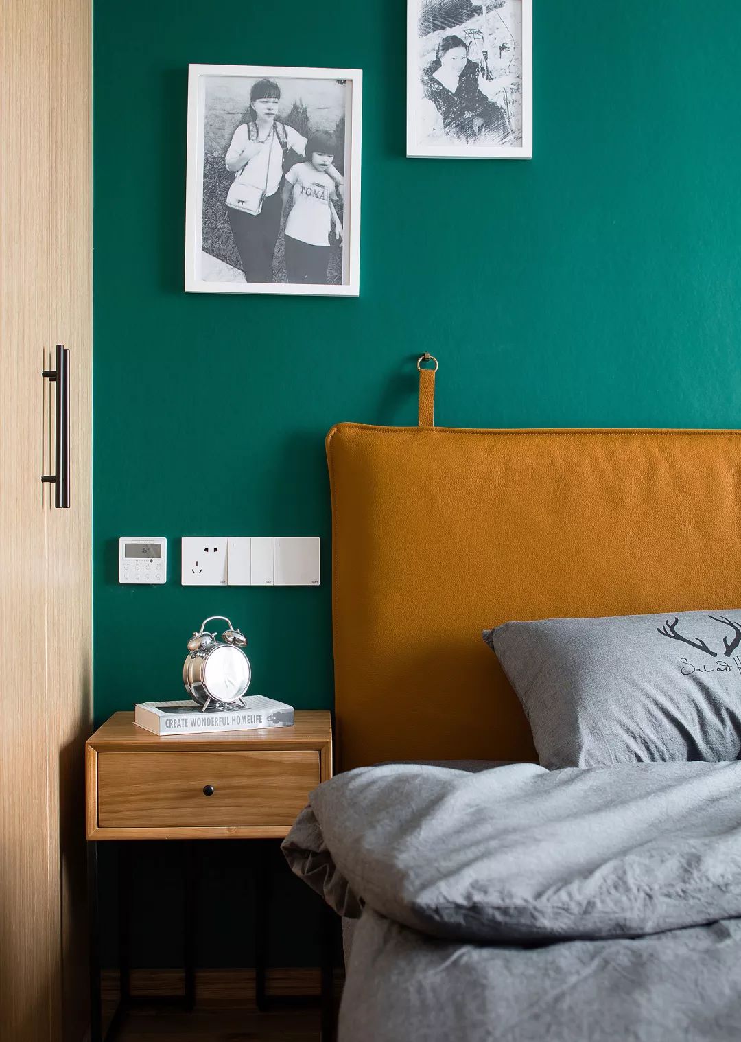 ▲深绿色的床头背景墙,定制的床,再搭配灰色的床品,及木色的衣柜,整个空间色彩丰富具有层次感。