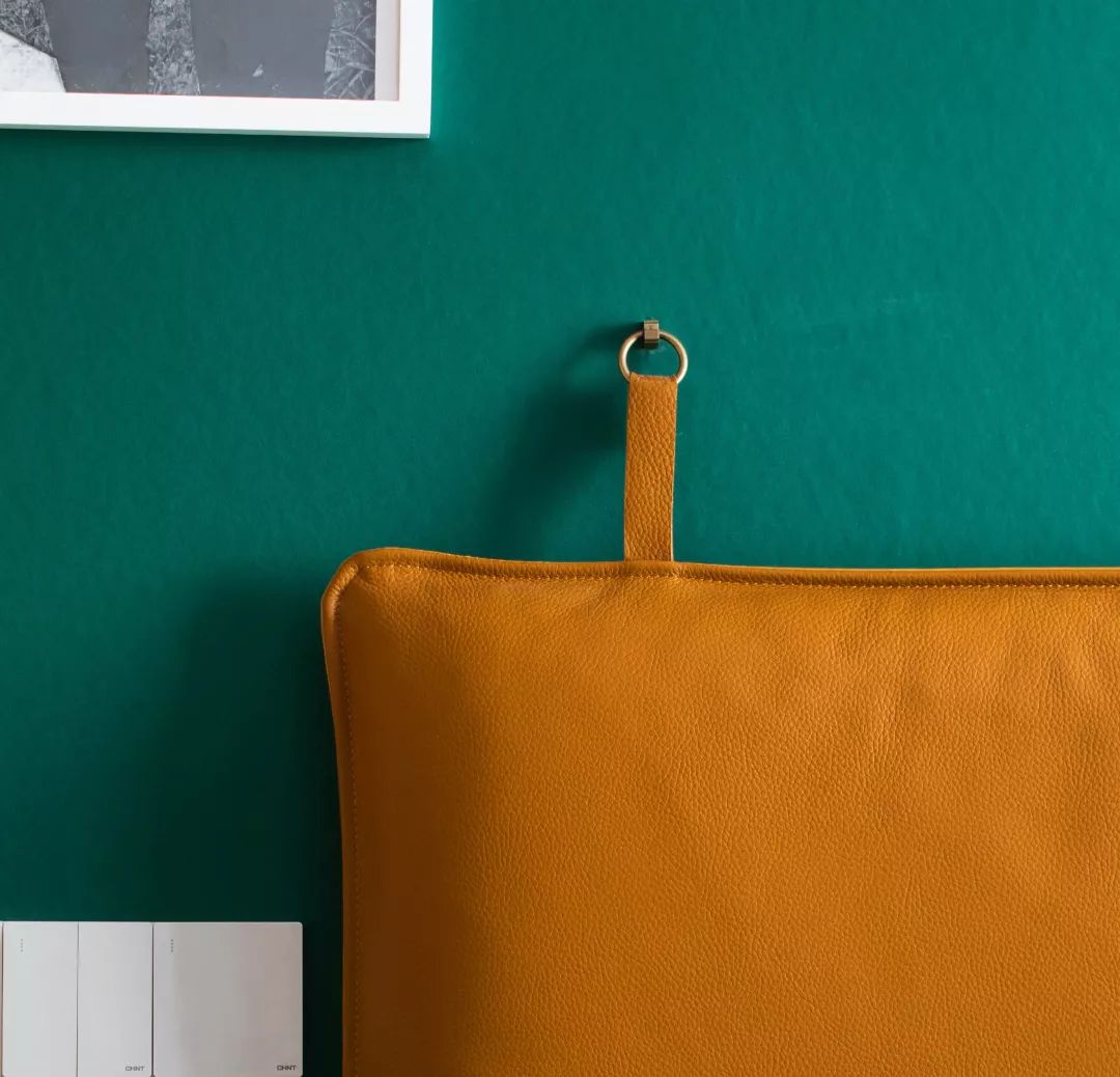 ▲棕色的皮革靠背,还有铜制扣子,在绿色背景墙的衬托下显得格外好看。