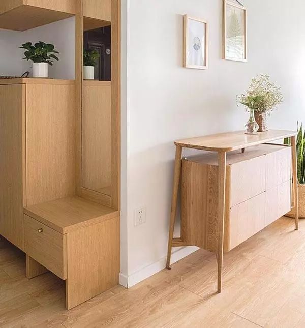 【鞋柜】入户玄关不大,自己亲手画的鞋柜图,高低柜的设计,不仅方便储物,还可以坐着换鞋,特别方便。【边柜】家具都是清一色的原木风,小清新的感觉,这样的家,待着舒适又自在。【客厅】整体装修很简单,吊顶也没有做,除了右边安装了一排筒灯,不过也是为了走风管机通道。没有做吊顶,房子显得高了许多,不那么压抑,