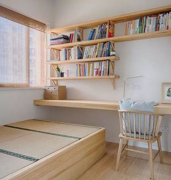 书房里有榻榻米,有书架、搁板书桌,这些都是统一定制的,风格颜色统一,清清爽爽。