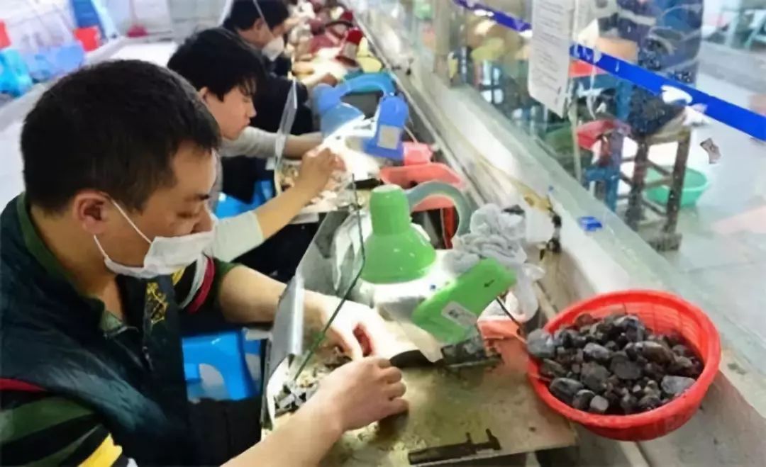 去皮后的琥珀按所需产品进行造型设计,有杂质的需要重新切割才能开始制作。如果是要做圆珠,那么还要先将料子切成方块,再磨圆,通过切割剔除瑕疵,重新分类。
