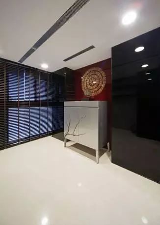 农村一直以来少不了神龛的存在,在旧式装修中比较传统,而本案将现代手法充分演绎的神龛,主墙处可见中国红烤漆为底与金笔提画百福图,搭以水墨画订制家私,传统与现代有了完美且协调对话。