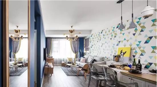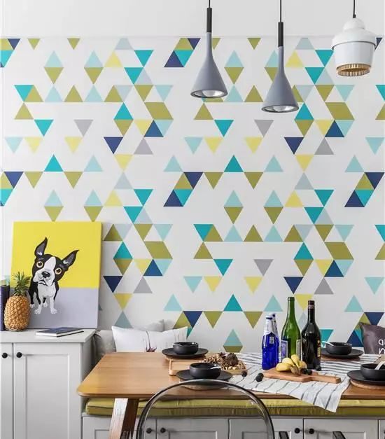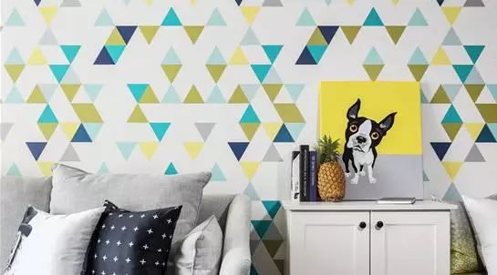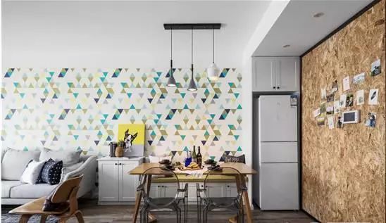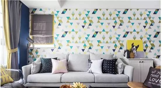 灰色沙发,花色抱枕,室内色彩丰富,每一种存在间都包容着相互关系,多面且统一。采用几何拼接墙纸拉伸出格局的灵动,用颜色来做空间围合,打破单调氛围。