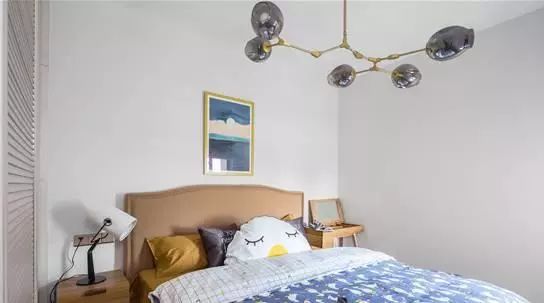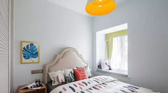 次卧沿袭整体的清新亮丽风,树叶生长的形状布满床品,品质卓越,色调与客厅如出一辙,立体感较强的空间无疑更加打动人心。