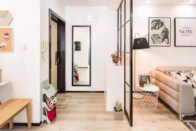 入户没有玄关的户型,在入门的正对面做了黑框玻璃隔断,加上白色的小鞋柜,满足收纳和分割空间的作用,入户门侧面的穿衣镜和小鞋架非常实用。