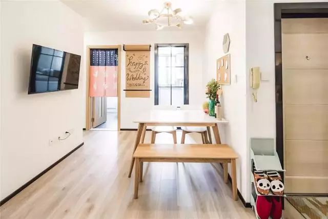 在客厅的另一侧是餐厅空间,摆放在走道上的原木风餐桌椅,墙面还挂了电视。黑框玻璃隔断门和布帘隔断,让餐厅更加明亮。