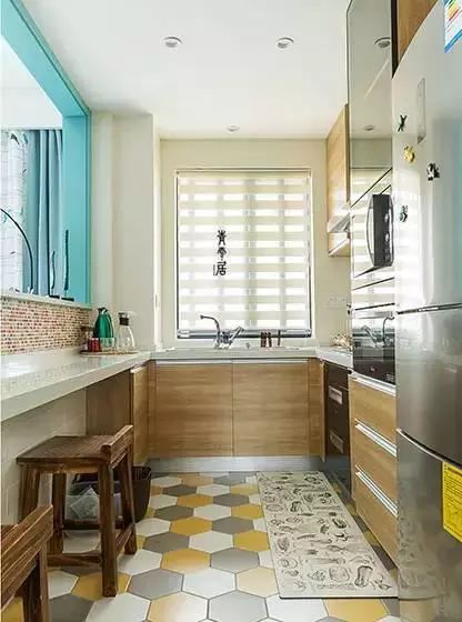 △厨房有一个自助吧台,空间利用率杠杠的,蜂巢地砖驱除单调感!