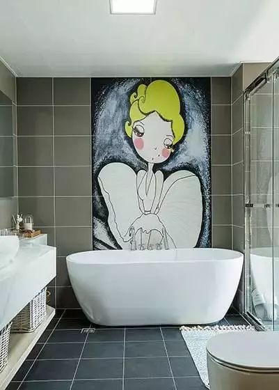 △卫浴间有板有眼,但这幅梦露卡通挂画绝对是视觉焦点,俏皮!