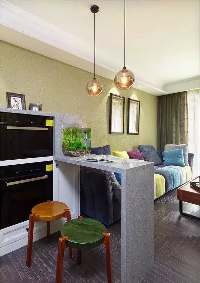 在沙发边做一个小吧台,这样品酒的时候还可以看看电视,也能避免小户型沙发座位不够的问题,让客厅多出几个位置。小户型吧台可以连着柜子一起做,吧台的底部或者侧边用来改造一些柜子,也可以让小户型多出几个平方的储物空间。其次比较适合小户型做吧台的地方就是厨房,把厨房改成开放式的,更不会那么拥挤,延伸一个小吧