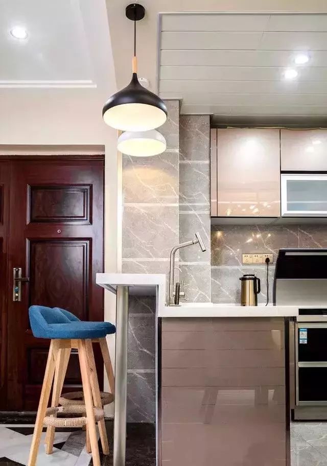 这样的小吧台对于单身公寓的屋主来说,完全可以作为餐厅来用,这样餐厅和厨房结合起来,就更加节约空间了,其他空间可以设计得宽敞一些。