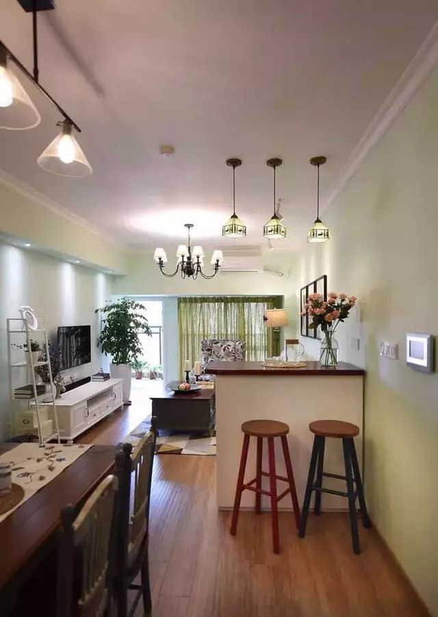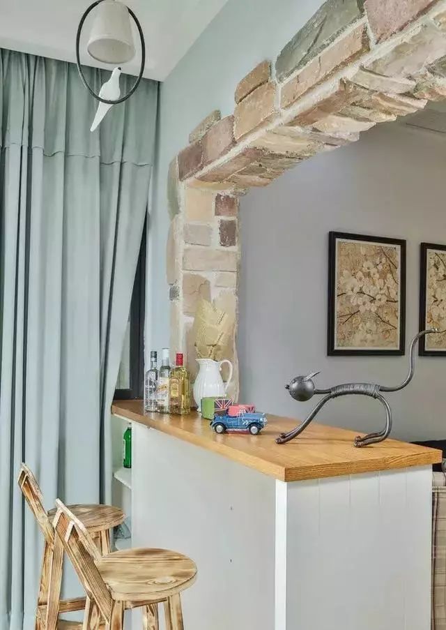 为了让客厅显得宽敞一些,很多屋主都会把阳台和客厅打通,这样加上一个小吧台作为隔断,既不会影响光线的流通,又能多出一个休憩的地方。