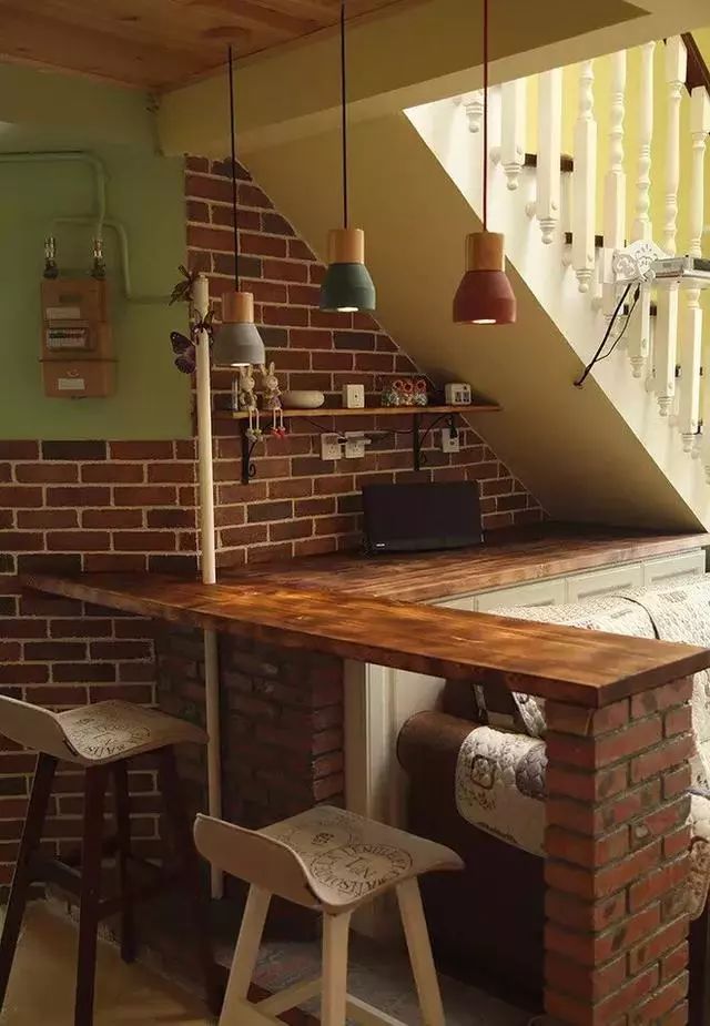 吧台的颜值也是很高的,红砖墙加上实木板,再搭配可爱的吧台椅和吊灯,这个小空间会让人感觉非常有格调。