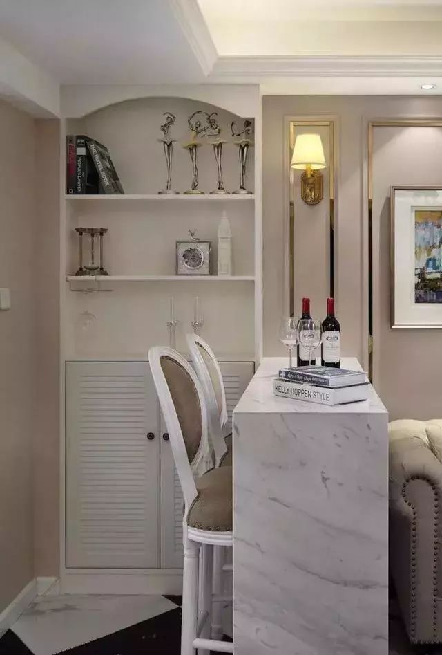 在沙发边做一个小吧台,这样品酒的时候还可以看看电视,也能避免小户型沙发座位不够的问题,让客厅多出几个位置。