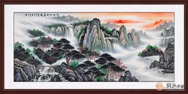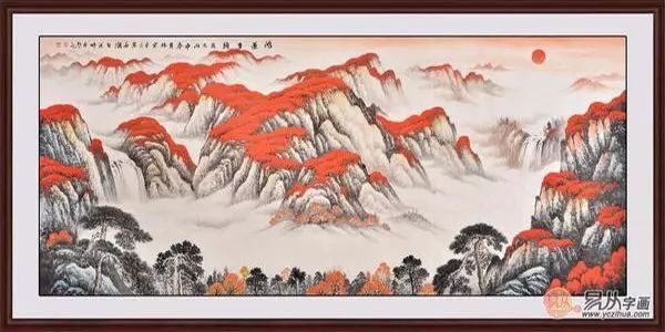 有没有一种“飞流直下三千尺”的壮观之感?常言道流水生财,也是财运滚滚的象征;瀑布激起云气,给人一种如梦如幻的仙境之感;绿树红花,旭日东升,意寓人间祥和;“山水环抱,藏风聚气”的地理元素融入其中,可谓前景开阔迎祥纳福。左有招财树,右有挡灾树,整幅作品青山绿水间尽现祥和美满、招财聚富的深远意境。所以客厅的装饰画就选山水画,意境深远,旺财转运,品位高,足够给你面子。