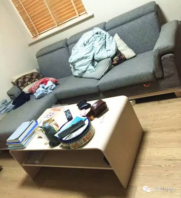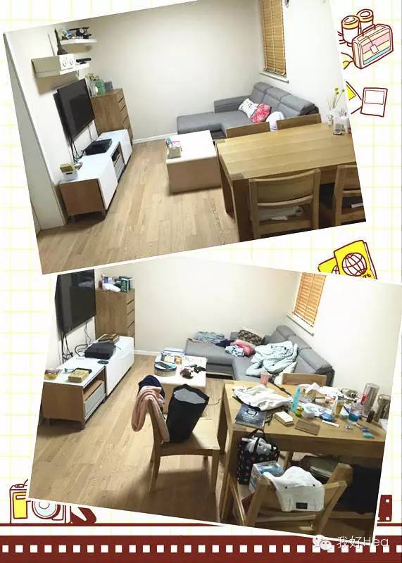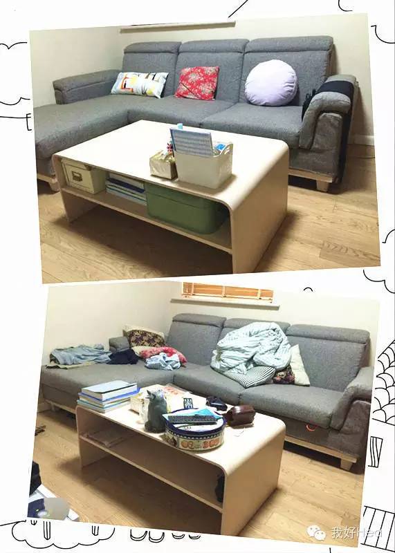 第一步,我将不属于这里的东西移走,比如在沙发上的衣服、被子,这些应该被放进衣橱;茶几上的照相机、饼干罐,这些应该被单独收纳。