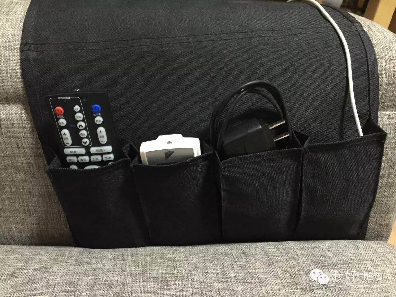 利用非常实用的沙发边收纳袋将遥控器、充电器全都放在沙发扶手上,不仅取用方便也不占空间。