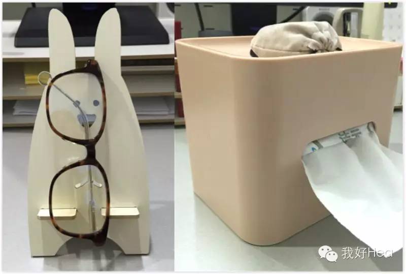 左边的兔子支架是用来放手机的,我平常也会用来挂眼镜。右边的纸巾盒大爱,纸巾竖起来抽取,上面还多了一层摆放小物件的空间,23元,淡淡的贝壳色和图片没差
