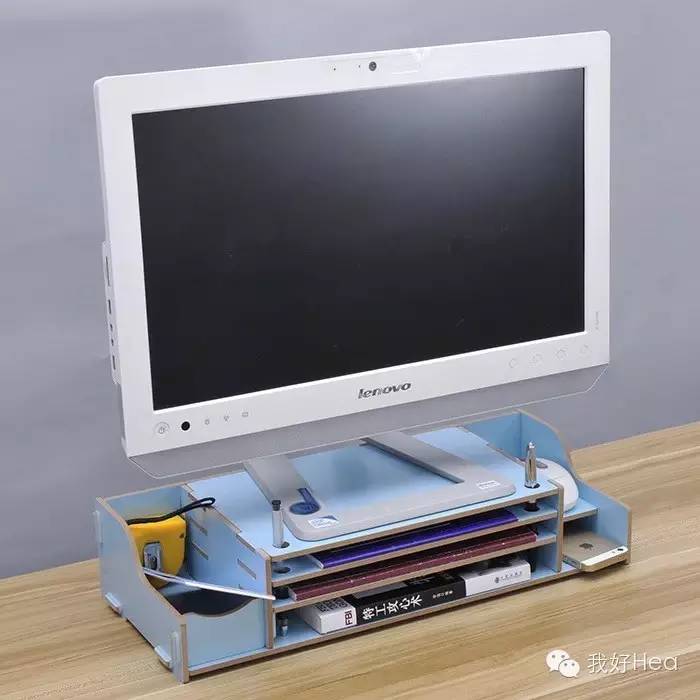 其他的常用小物比如便签、计算机、订书机由于比较重,挂在墙上很容易掉下来,我添置了一个双层电脑增高置物架,40元