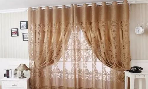 这种窗帘上下分别穿套在两个帘轨上,然后将帘轨固定在窗框上,可以平拉展开,也可用饰带。
