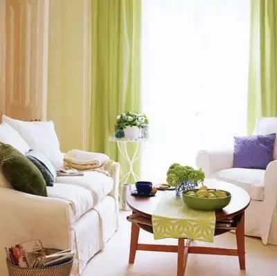 ▲单层纯色窗帘非常衬托茶几的绿色桌布