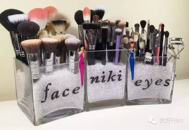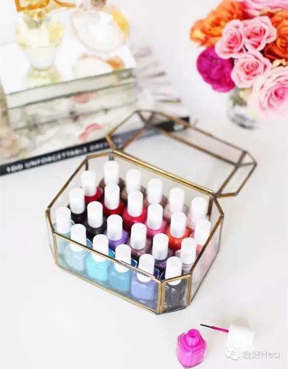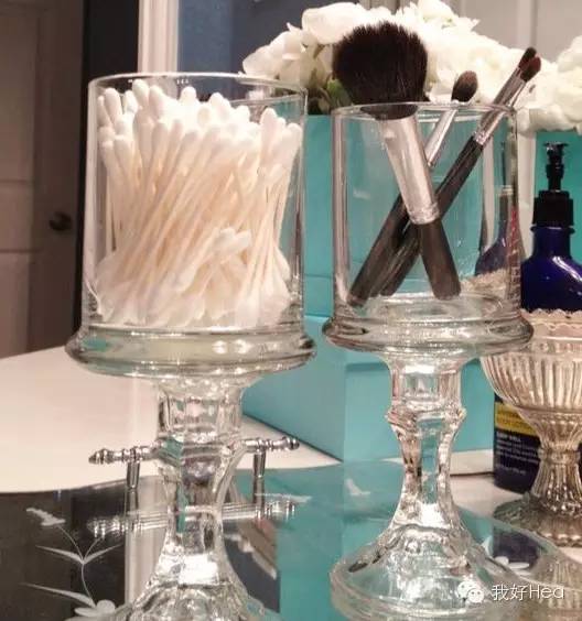 管状与长条形的化妆品,比如睫毛膏、刷子等,竖着收纳是最节省空间的做法,透明玻璃瓶和闪闪的水晶砂可以有效提高收纳颜值