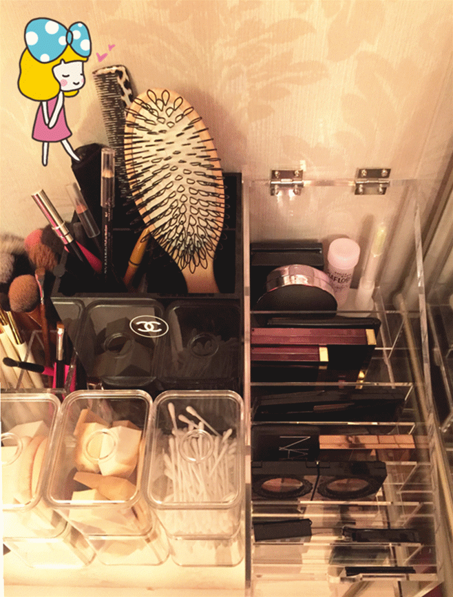 腮红、眼影大部分是圆形或者方形的小盒子,妮妮用的依然是亚克力收纳盒,有的来自muji,有的来自某宝,常用和不常用的区分隔开