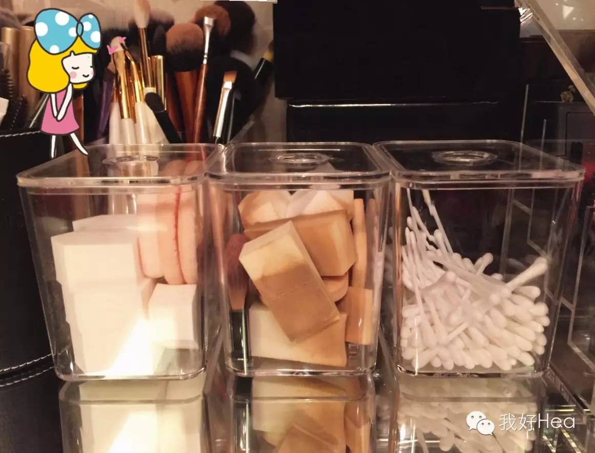 为了保证干净,美容工具的收纳最好使用透明有盖的器皿,妮妮使用的这款亚克力透明储物罐,三个一套,宜家购入