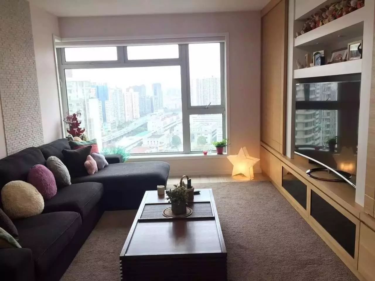 3、电视柜做成了顶天立地的“巨人柜”,把零碎物件全部藏起来,心动的星巴克生肖熊放在最醒目的位置。