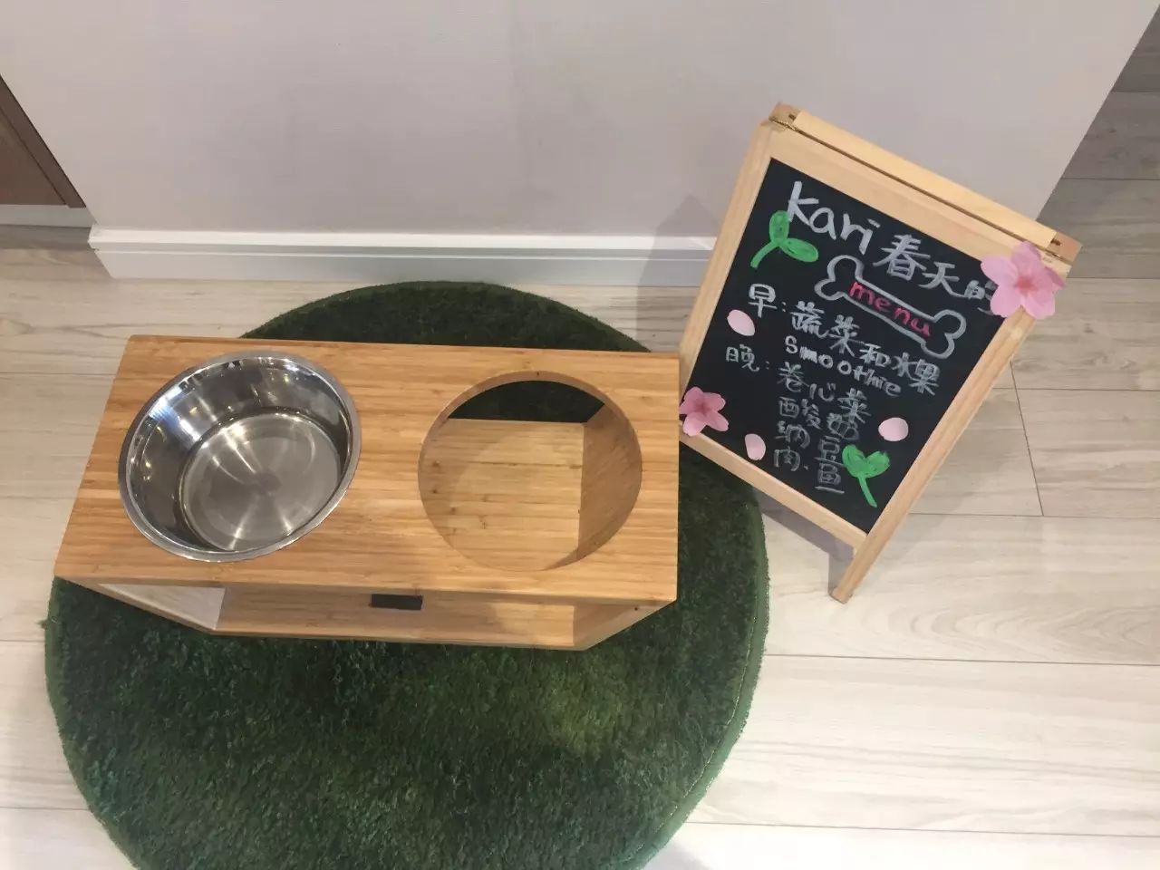 4、狗狗的每日专属食谱,写在一块小黑板上。贴上樱花?剪纸,增添春的气息。